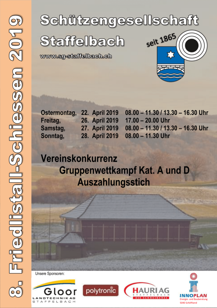Details zum Friedlistallschiessen sind auf der neuen Webseite der SG Staffelbach ersichtlich: https://sg-staffelbach.ch/friedlistallschiessen