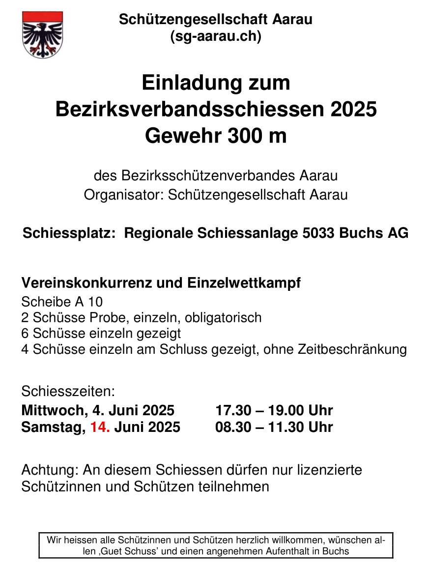 Bezirksverbandssschiessen In Kalender importieren Daten Mittwoch, 04.06.2025 17:30 - 19:00 Samstag, 14.06.2025 08:30 - 11:30 Einladung & Schiessplan Einladung Bezirksverbandsschiessen 2025, SG Aarau43.53 KB