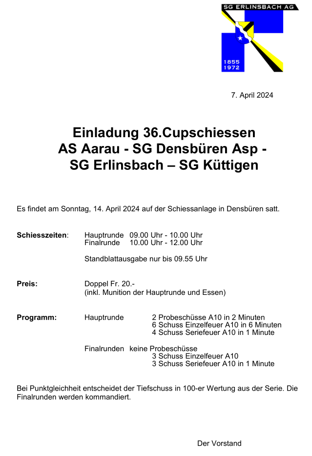 Cupschiessen KSV In Kalender importieren Datum Sonntag, 14.04.2024 09:00 - 10:00 Einladung zum Cupschiessen des Kirchberg-Schützenverbandes52.31 KB