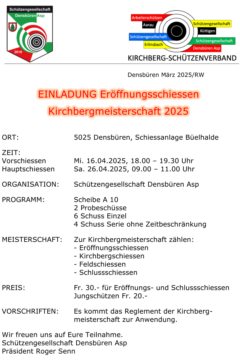 Eröffnungsschiessen Kirchbergmeisterschaft In Kalender importieren Datum Samstag, 26.04.2025 09:00 - 11:00 Einladung Eröffnungsschiessen 2025312.19 KB