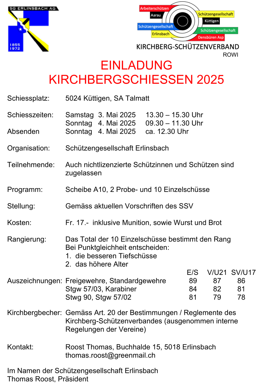 Kirchbergschiessen, SG Erlinsbach In Kalender importieren Daten Samstag, 03.05.2025 13:30 - 15:30 Sonntag, 04.05.2025 09:30 - 11:30 Einzelrangliste Kirchbergschiessen 2024 Einzelrangliste Kirchbergschiessen 2025197.05 KB Einladung Einladung Kirchbergschiessen 202596.64 KB