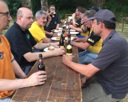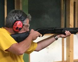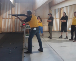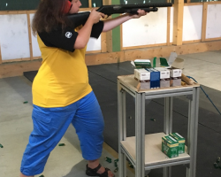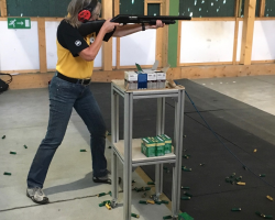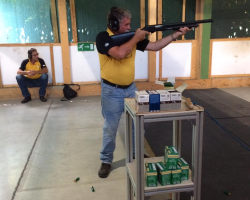 Nach dem Mittagessen vom Grill wurden andere Waffen eingesetzt und zwar eine Repetier-Flinte und eine Selbstlade-Flinte (Langwaffen-Disziplin „PP 1“, Minimum 40 Schuss). Beschossen wurden 5 Kippscheiben. Die Zeit wurde auf Kommando gestartet und endete mit dem Kippen der 5. Scheibe rechts. Dafür standen in jedem Durchgang 6 Schuss zur Verfügung. Das Verfehlen einer Scheibe wurde mit 5 Sekunden bestraft. Wir dürfen mit einem gewissen Stolz behaupten, dass wir uns bei dieser ungewohnten Disziplin alle sehr gut angestellt haben.