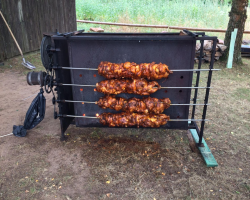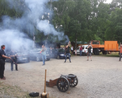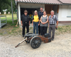 Während die Güggeli sich am Drehgrill ihre optimale Bräunung holten, wurden die Geburtstagsgäste durch ein Böller-Kommando überrascht. Die mit ohren-betäubendem Knall verbundenen Schüsse wurden auf Kommando und einstudierten Abfolgen vorgeführt. Auch dieses Szenario war für uns neu und sehr beeindruckend.