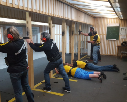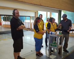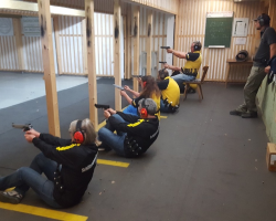 Anschliessend wurden uns Präzisionspistolen und je 5 Magazin übergeben und wir wurden in die zu absolvierenden Wettkämpfe eingeführt. Mark Leis als Spitzenschütze instruierte die jeweiligen Stellungen, indem er das ganze Programm vorgeschossen hat.
